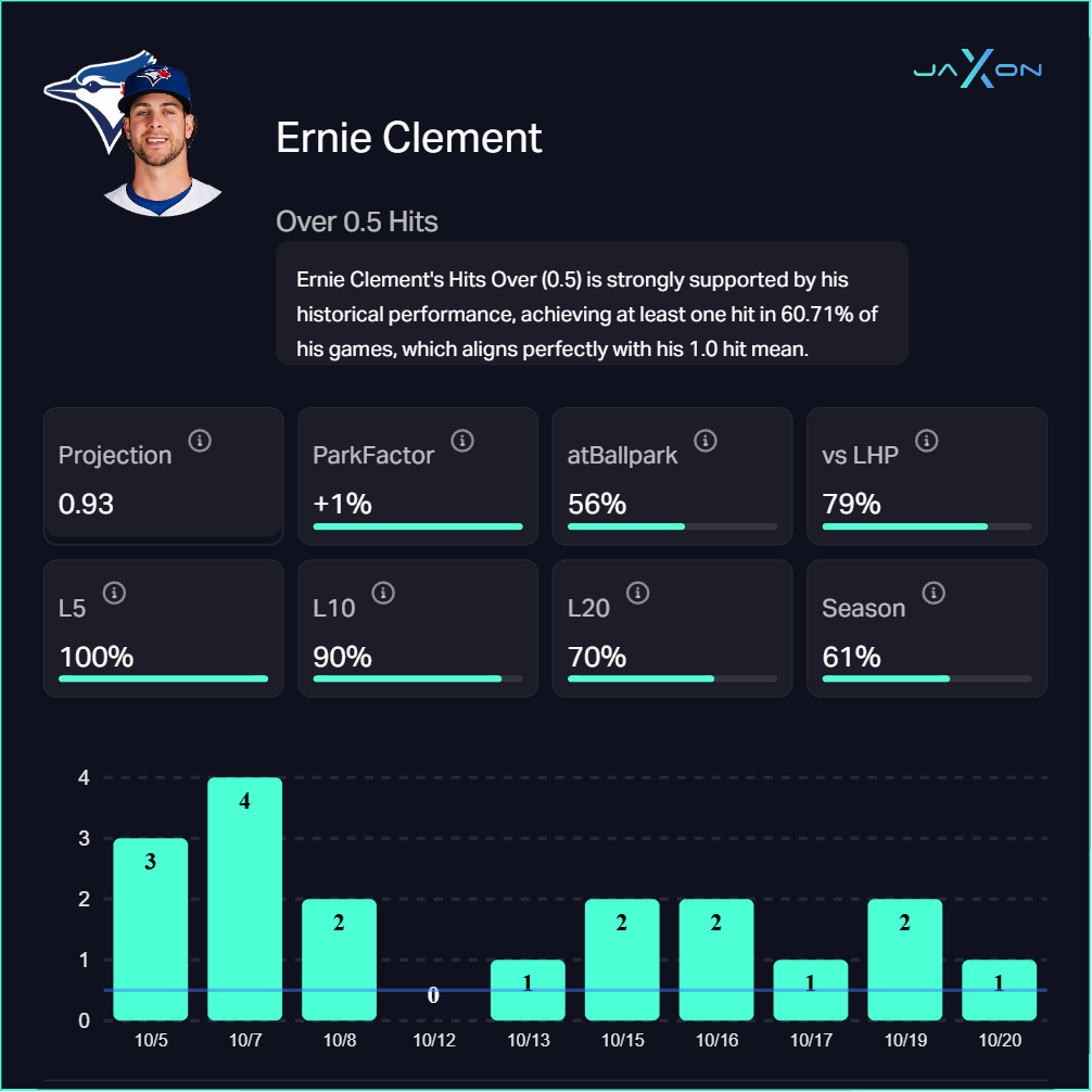 One player who I think should get a hit against Snell is Ernie Clement. Clement Over 0.5 Hits has been a consistent winner in the playoffs. Not only that but Ernie has hit in 79% of games against Left handed starters this season.