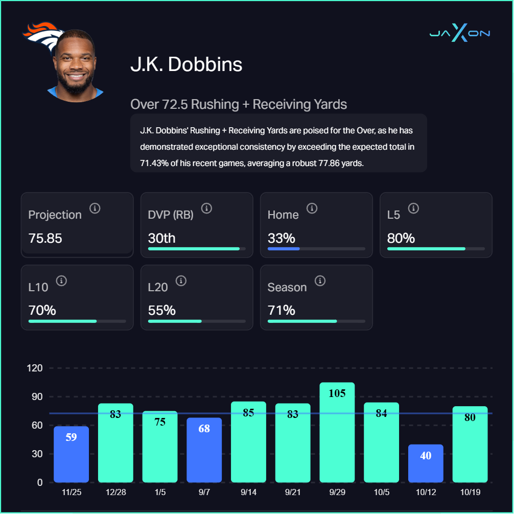 Dobbins is averaging nearly 78 total yards per game and has cleared this mark in four of his last five outings. When Denver plays at home, his usage spikes even higher, with an average north of 84 yards.