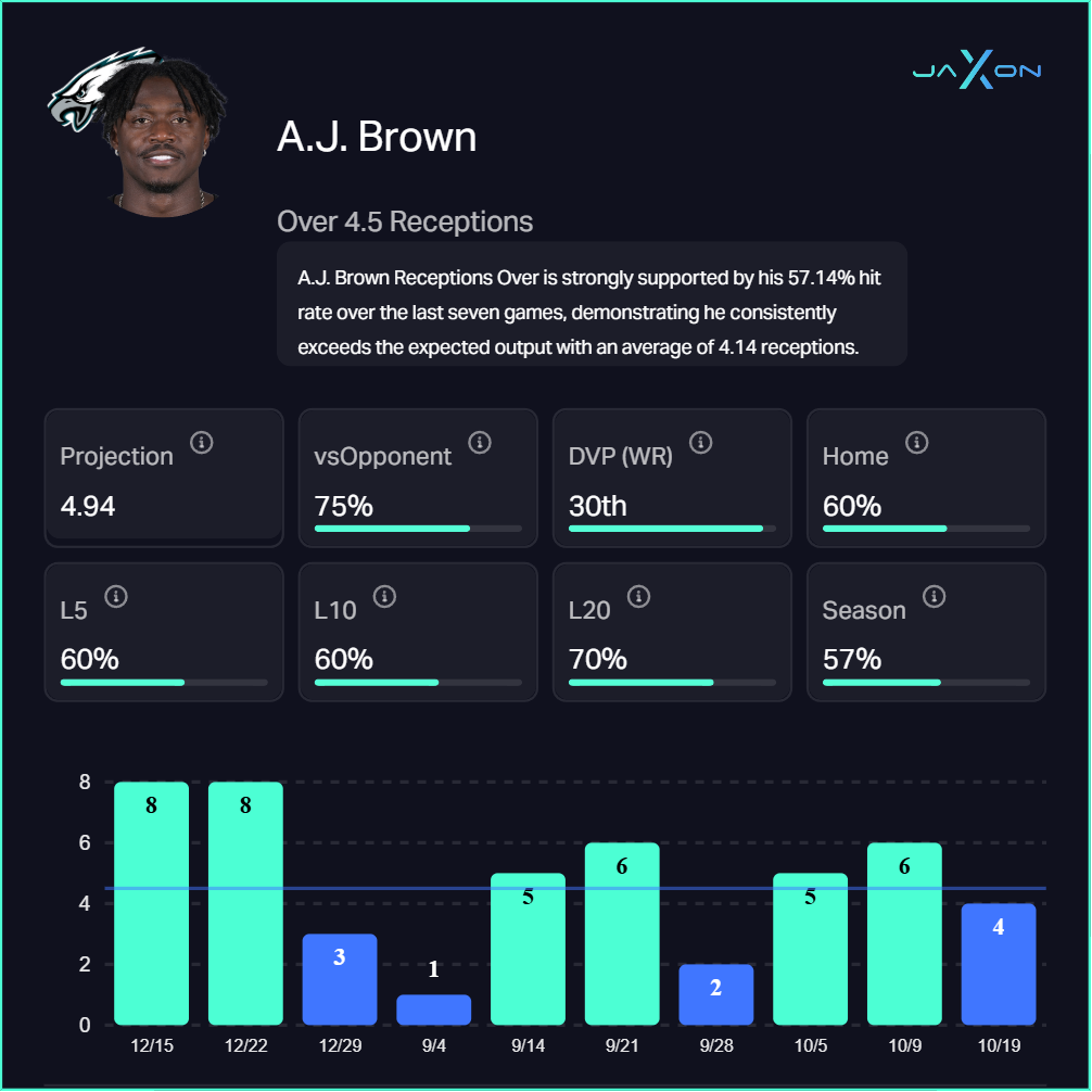Brown caught six passes in their previous meeting this season. With Philadelphia looking to bounce back after a recent loss and re-establish rhythm on offense, expect heavy usage again.