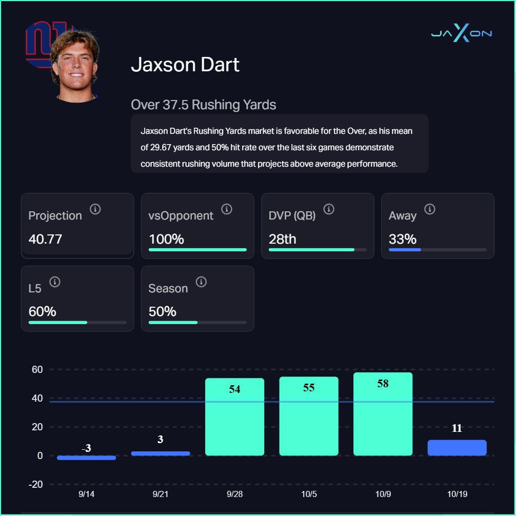 This one is more of a hidden gem. The Eagles have allowed the fifth-most rushing yards to opposing QBs and give up more than nine yards per scramble. Dartās rushing has become a key part of the Giantsā offense. Heās averaging close to thirty yards per game, but that number jumps significantly when facing teams with strong pass coverage.