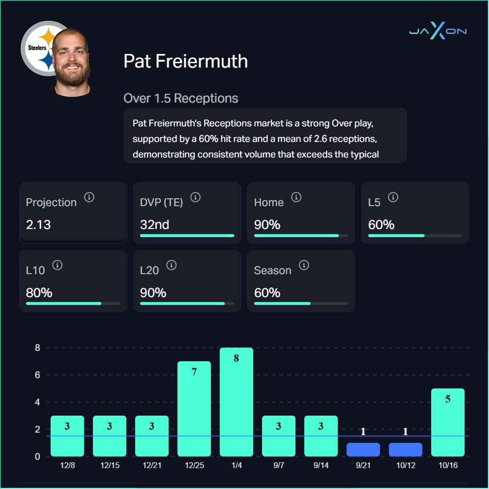 Green Bay ranks dead last in the NFL against tight ends, allowing frequent short completions over the middle. Freiermuth has cleared this mark in 80% of his last 10 games, averaging nearly four catches per contest over that span. With Pittsburgh expected to play from behind and the Packersā front likely neutralizing the run, Rodgers should lean on Freiermuth early as a safety valve against pressure.