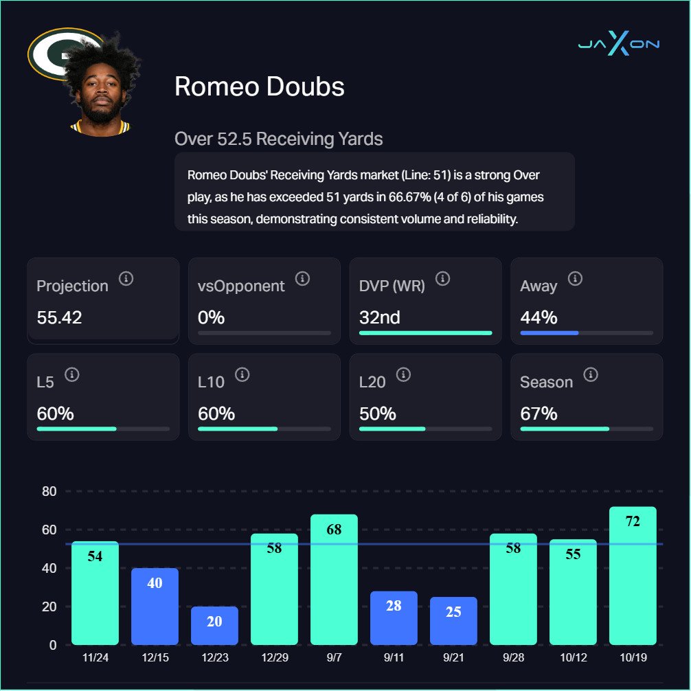 Pittsburghās secondary has been shredded all year, giving up a league-worst 305.8 passing yards per game and a massive 137.5 yards per game to outside receivers. Doubs fits perfectly into that soft spot. With Watson out and Wicks sidelined, Doubs is the clear WR1 for Jordan Love. Heās seen target shares of 35% and 28% in his last two games and has topped this number in four of six overall. His average of 51 yards per game sits just below the line, but the combination of increased volume and the worst pass defense in football makes the Over look like the right side.