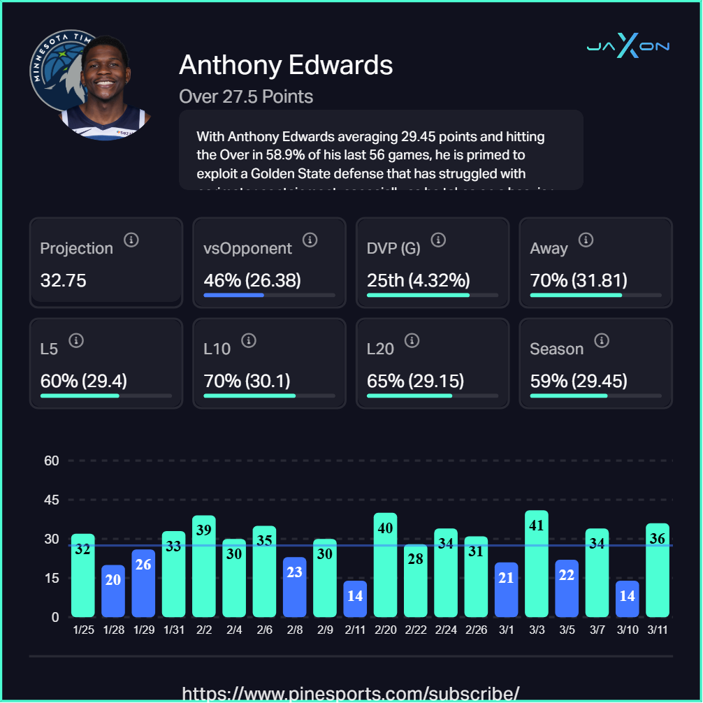 Minnesota's transition offense ranks third in efficiency and third in points added per 100 possessions, and Golden State ranks 27th in transition frequency allowed. The Wolves also have Rudy Gobert anchoring rim protection against a team that will be forced to attack the paint when the outside shots stop falling. Anthony Edwards is averaging 29 points per game and gets a Warriors defense that ranks 26th in mid-range effective field goal percentage allowed.