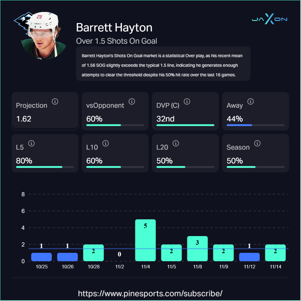 Like Schmaltz, he benefits from that same 32nd-ranked defensive weakness. Hayton's been aggressive lately, hitting the over in 80% of his last five games, and he averages 2.67 shots when facing Anaheim. With him centering the second line and generating consistent offensive zone time, 1.5 shots should clear comfortably.