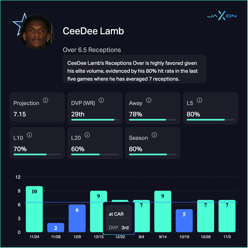 Lamb is the top target, ranking 2nd in targets per game at 10.8 and averaging 7.0 receptions. Hitting the Over in 80% of recent games shows his high involvement and makes this bet logical in a Cowboys win.