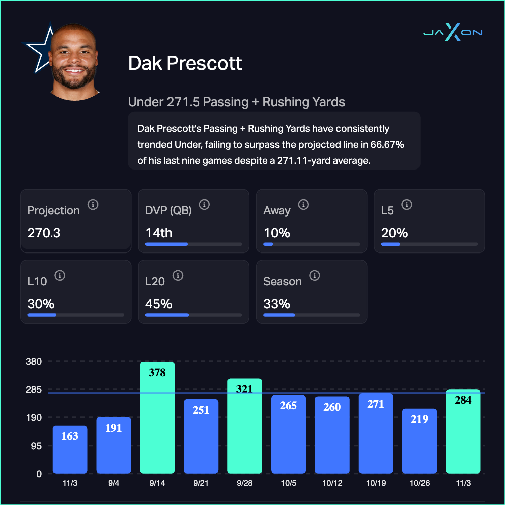 Prescott averages 271.11 yards per game, but when you isolate road games? That number drops to 237.2 yards, and he's hit the Under in 100% of his away games this season.