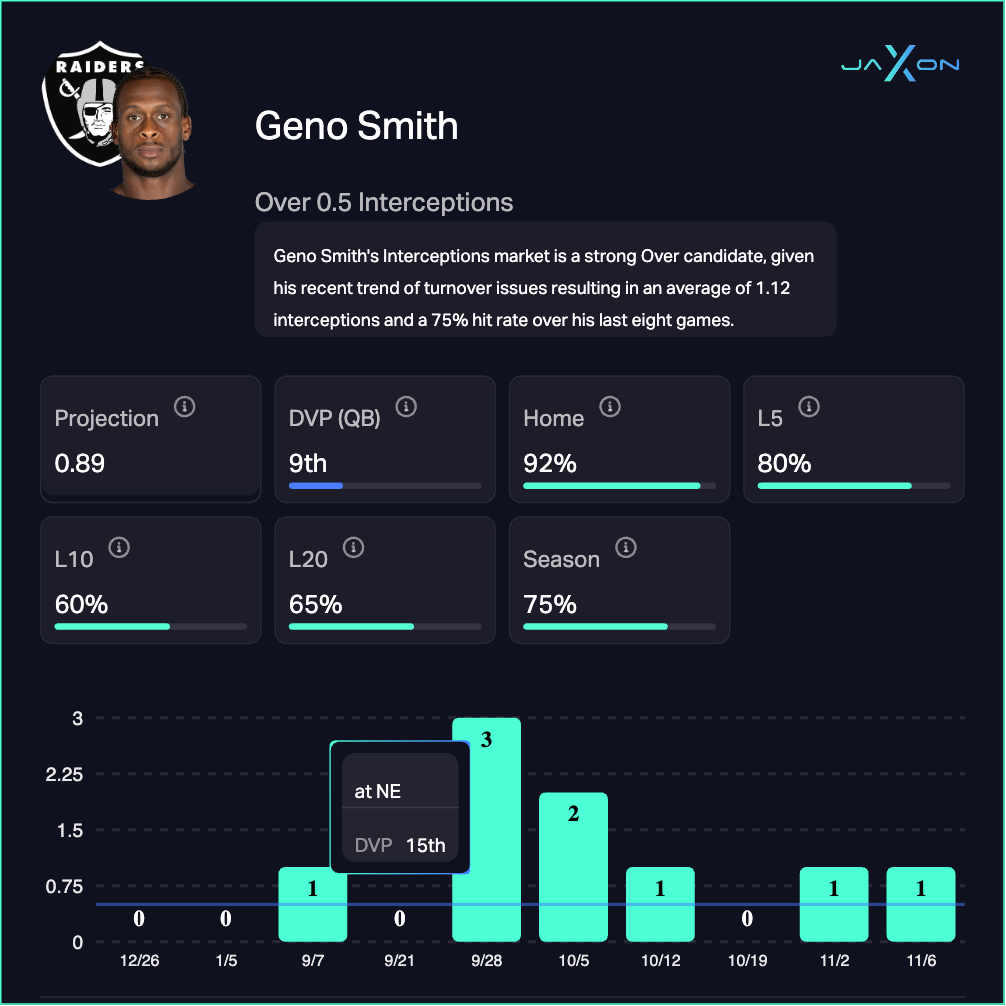 Smith has thrown 12 interceptions this season. That's DEAD LAST in the entire league. He's averaging 1.12 picks per game, and he's hit this Over in 75% of his games this season. But here's where it gets absolutely ridiculous...