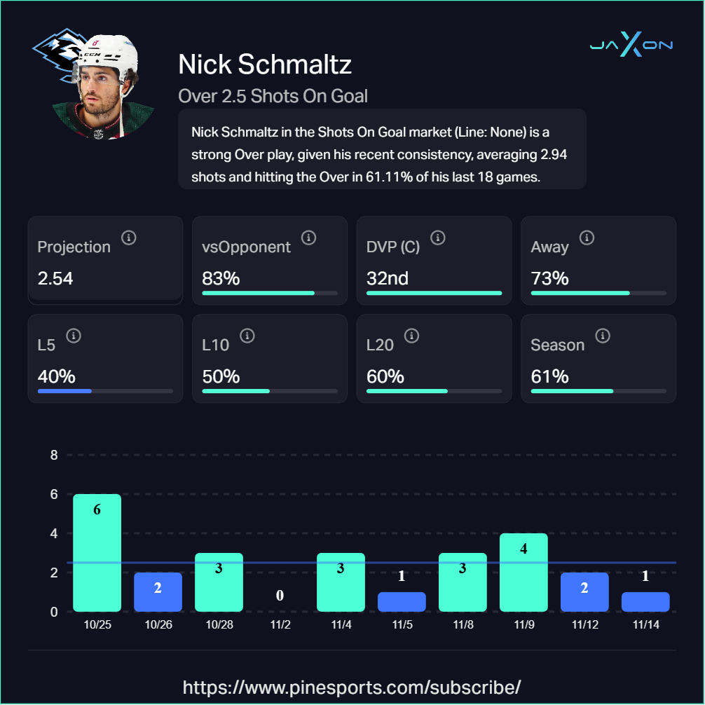 Nick Schmaltz over 2.5 Shots on Goal (+100)