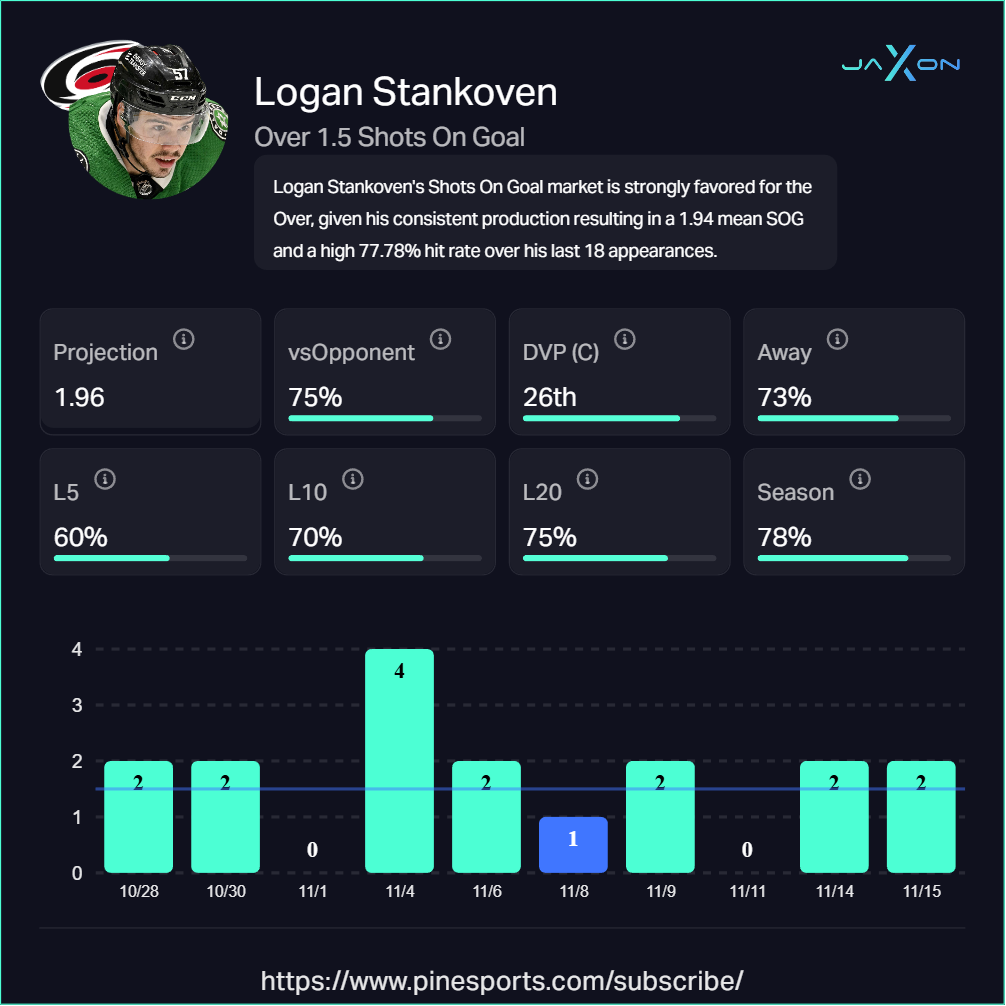 Stankoven presents a strong betting opportunity, especially considering Boston ranks 26th in the league defending his position. He averages 2.22 shots when playing on the road and overall has cashed this line in 14 of 18 games this season. Logan has averaged 4 per game against the Bruins over four previous meetings.