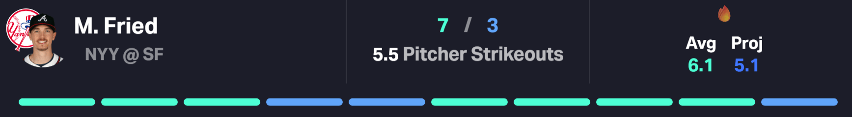 Over his last 34 starts, Fried averaged 18.06 outs per game, meaning he consistently pitches deep into games and gives the strikeout total plenty of runway. He’s cleared this line in 9 of his last 13 appearances.