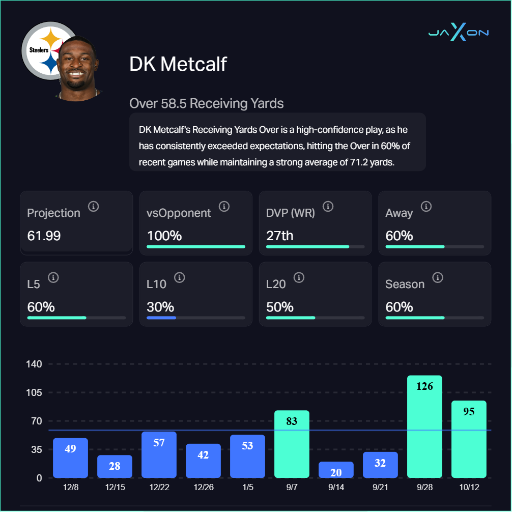 Metcalfās chemistry with Aaron Rodgers has quietly become one of the leagueās most efficient duos. Heās averaging 71.2 yards per game, hitting this number in 60% of contests, and now faces a Bengals secondary ranked 27th in yards allowed to wideouts. With his 18.7 yards per catch average, he only needs a few solid connections to clear this total. Expect at least one deep shot to swing it.