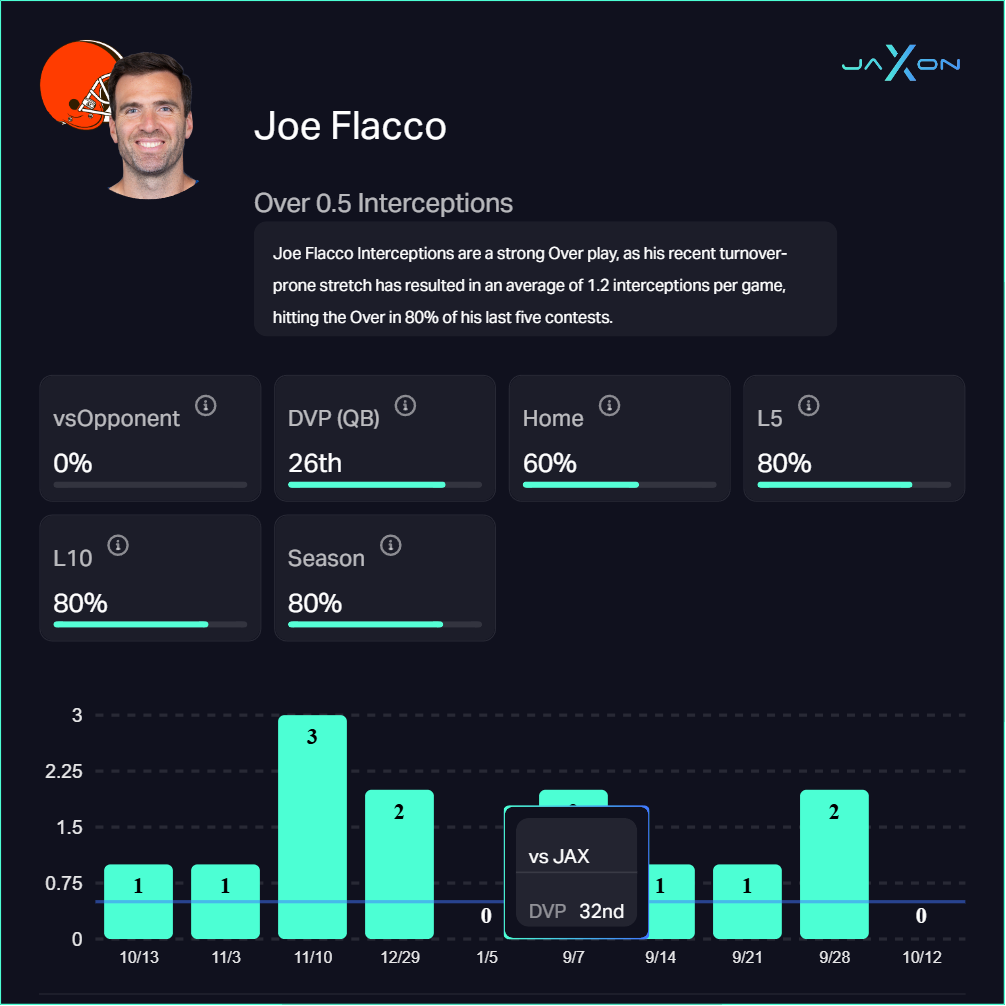 Pittsburghās defense thrives on chaos and Flaccoās decision-making has fueled plenty of it. Heās thrown at least one pick in four of his last five games (1.2 per game average), while the Steelers rank 5th in total interceptions. Against a relentless pressure front thatās top-five in sacks, itās hard to imagine Flacco escaping this one clean.