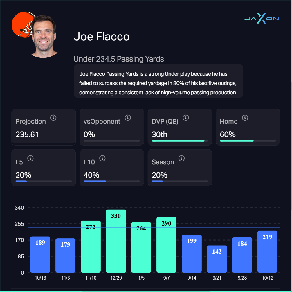 Even with the Steelersā secondary allowing yardage volume, Flacco hasnāt shown the efficiency to capitalize. Heās averaging just 206.8 passing yards per game and has gone under this mark in 80% of his starts. In his lone 2024 matchup with Pittsburgh, he threw for 168 yards. Unless this turns into unexpected garbage time, the under looks sharp.