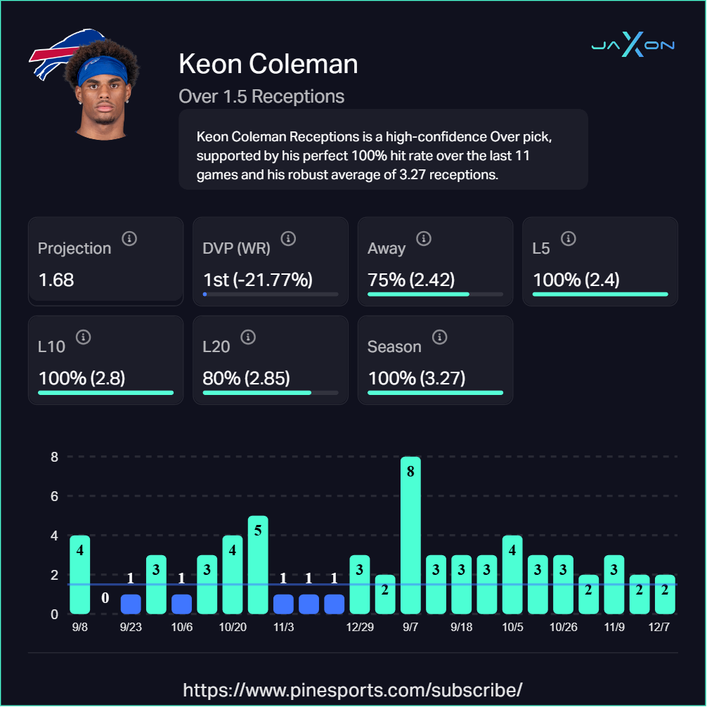Keon Coleman has cleared this number in every single game he's played this year. He has a perfect 11-for-11 record hitting the over, with an average of 3.27 receptions during that stretch. Even in road environments where some receivers struggle, Coleman has posted a flawless 5-for-5 record with a 2.8 reception average. His streak even extends into last season, going back 13 consecutive games.