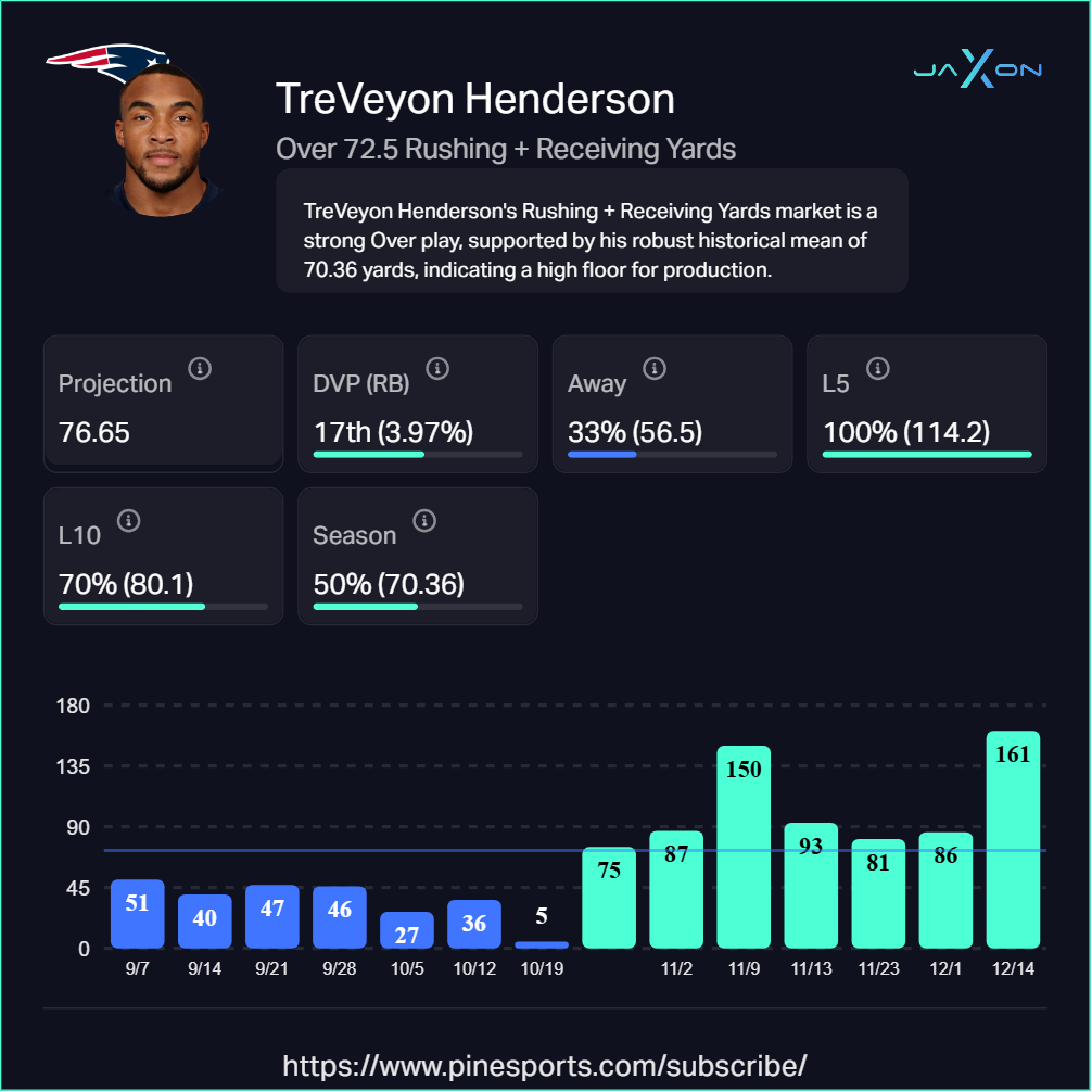 Henderson's full-season average sits at 70.3 yards per game across 14 contests, landing just under this 72.5 line, but Stevenson was originally the primary back early in the season. The real red flag appears in his road splits, where he's averaged only 56.5 yards in six games as the visitor and cleared this number just twice for a 33.33% hit rate.