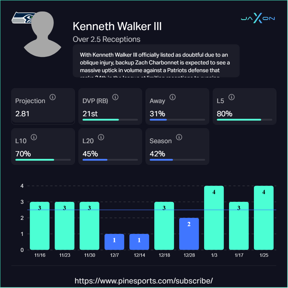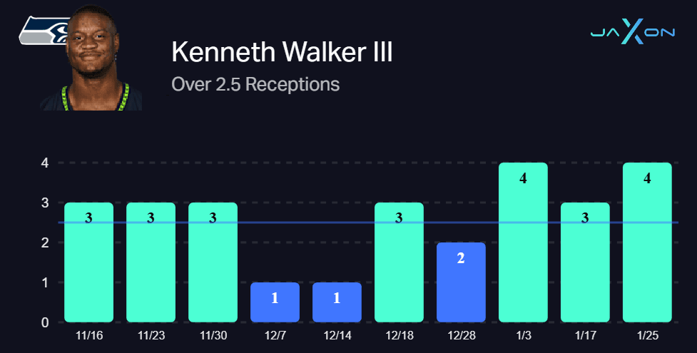 Kenneth Walker III is widely known for his goal-line dominance and explosive rushing, but his involvement in the passing game is an undervalued part of his profile. Walker has been a consistent target-earner lately, averaging 3.2 receptions per game over his last five games, and he's hit the over on this prop in 70% of his last ten games.