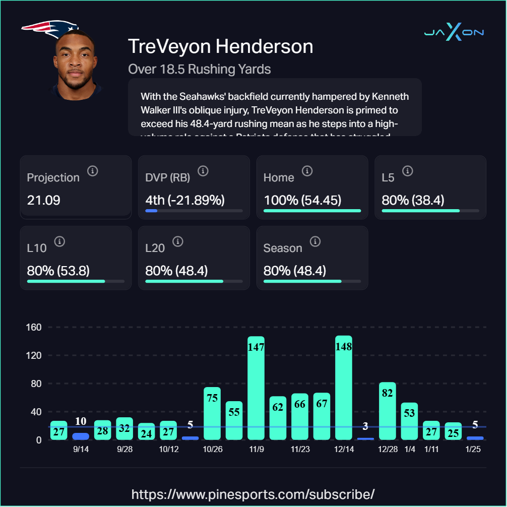 The Seahawks' defense is elite, ranking third in rushing yards allowed and first in yards per carry allowed at 3.7. However, they rank 21st in tackle efficiency and 24th in total missed tackles with 109. Henderson ranks eighth among all running backs in rushing EPA and fifteenth in yards per carry at 5.06. He averages 10.59 carries per game, but half that many should be enough to clear this line.
