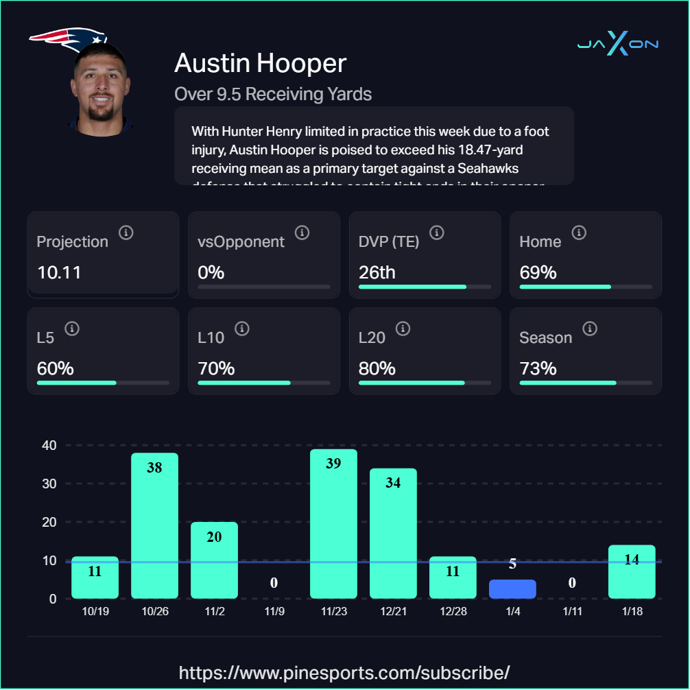 He ranks fifth among tight ends in yards per target at 10.12 and eighth in yards per reception at 12.52. The Seahawks rank 21st in the NFL against the tight end position specifically for receiving yards. While their cornerbacks eliminate the perimeter, they often allow space in the intermediate middle of the field and Hooper's 80.77% catch percentage makes him the perfect candidate to exploit this.